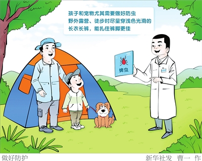 北京大学第一医院感染科主任医师徐京杭建议,野外露营、徒步时尽量穿浅色光滑的长衣长裤,能扎住裤脚更佳。使用含有避蚊胺的防蚊产品也能起到减少蜱虫叮咬的作用。在草丛、树林等地活动后,家长要重点检查孩子耳后、脖子、腋下等部位,看看有没有新增的“小黑点”。