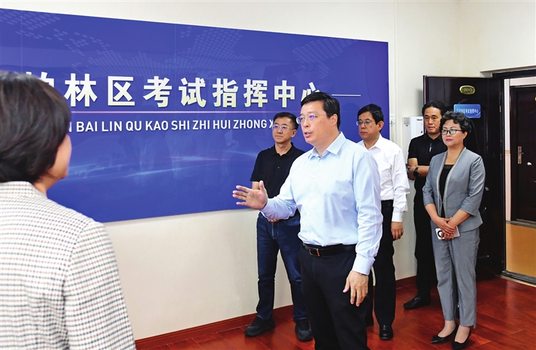 今年全市报名高考考生3.9万余人,共设10个考区、38个考点、1118个考场、114个备用考场。市委、市政府高度重视高考工作,精心组织、及早安排、周密部署,全过程全链条做好考务组织和安全保障各项工作。韦韬首先来到市外国语学校考点,实地查看入场安检通道、考生身份识别、通信信号屏蔽等系统运行情况,走进候考室、电子监控室及标准化考场,详细了解考场布置、安全管理、应急准备等工作,叮嘱考点负责同志再梳理、再检点,及时查缺补漏、消除风险隐患,周密规范做好各项工作,确保考试平稳有序、万无一失。