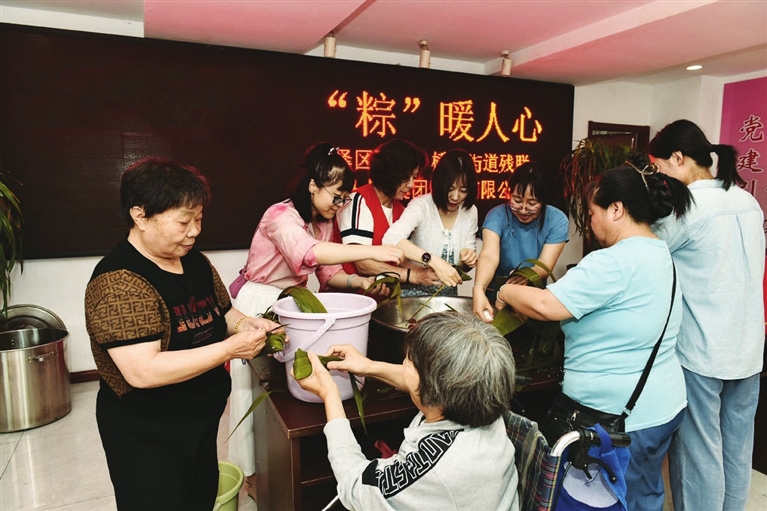 6月6日,迎泽区残联举行关爱活动,志愿者和残疾人一起包粽子,情谊浓浓。牛利敏 摄