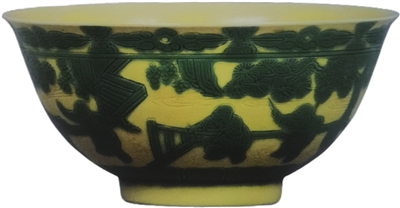 晋祠博物馆收藏的这件瓷碗外壁刻绘庭院中诸童嬉戏于苍松下,或转风车,或敲锣打鼓,情态生动,童趣盎然。纹饰刻画细致,衣褶之处,清晰流畅,颇见匠心。黄绿二彩明净无瑕,其黄娇艳欲滴,其绿翠韵怡人,可以说代表了清雍正御窑精湛绝伦的制瓷水平。