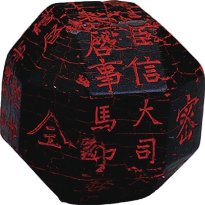 该印质地为煤精石,呈八棱多面体,一共有26个印面。其中正方形印面18个,三角形印面8个。印面边长均为2厘米。通体高4.5厘米,宽4.35厘米,重75.7克。因年久浸蚀,印体表层已有多道裂纹,局部剥落,棱角略有残损。