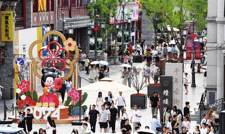 端午假期,来自全国各地的游客走进钟楼街、天龙山、晋祠、太山、双塔公园等太原市知名景区、街区,感受“锦绣太原”的独特魅力。图为6月9日,钟楼街上游人如织。邓寅明 摄