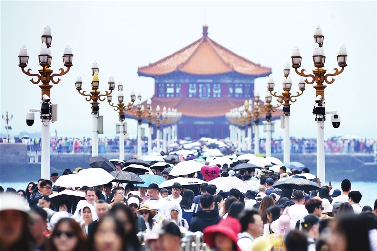 6月9日,游客在山东省青岛市栈桥景区观光游览。端午小长假期间,人们在多姿多彩的活动中尽情享受假日。新华社发 (王海滨 摄)