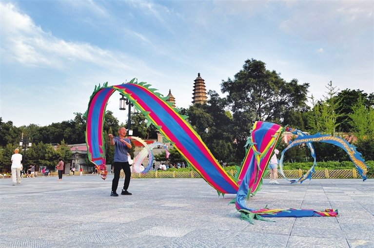 6月11日,在双塔公园内锻炼的市民展示单人舞龙,享受运动健身的乐趣。邓寅明 摄