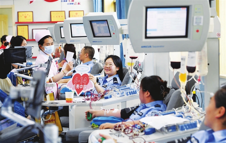 6月14日是第20个世界献血者日。6月13日,公安万柏林分局民警自发在市血液中心义务献血,奉献爱心。牛利敏 摄