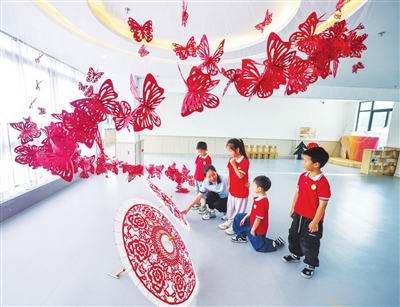 6月13日,孩子们在老师的带领下参观剪纸作品展。近期,浙江省湖州市长兴县李家巷镇中心幼儿园举行了校园“剪纸文化艺术节”。李家巷镇中心幼儿园是剪纸艺术特色幼儿园,本次剪纸艺术节包括剪纸及纸艺作品展、创意剪纸活动、环保纸艺作品制作、校园剪纸义卖等内容,激发孩子们对剪纸及传统纸艺的兴趣,同时也培养孩子们热爱剪纸艺术的热情以及绿色环保的理念。新华社记者 徐 昱 摄
