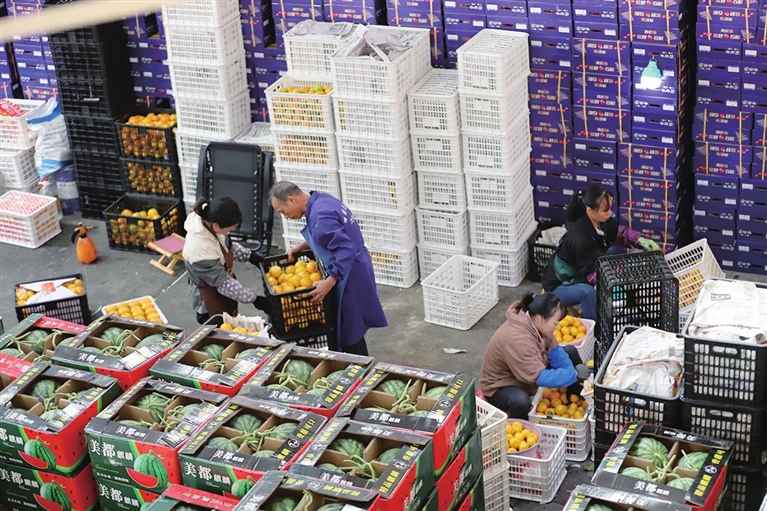 6月14日,河西农副产品批发市场一商户正在整理刚刚到货的西瓜、甜瓜等消暑水果。随着气温升高,各种消暑水果进入销售旺季,该市场积极组织货源,增加备货量,保障供应。张昊宇 摄