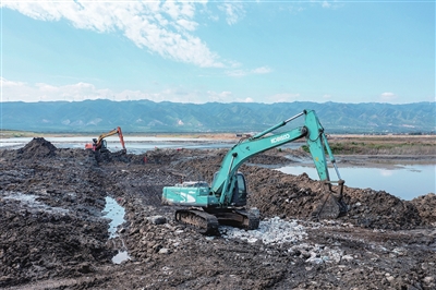 下图:6月5日,工程车在山西运城盐湖进行生态修复施工(无人机照片)。