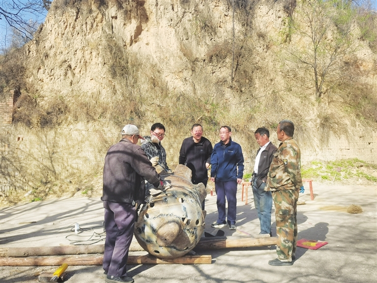 古钟铸成于康熙年间,原挂于村内的龙王庙。30年前,因人偷盗致其损坏。寨上社区书记带领社区“两委”成员与古交市文物所工作人员多次去现场查看研究,希望可以让古钟重新出现在大众面前。