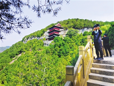 仲夏并州,草木丰茂。6月16日上午,天龙山景区游客如织,东峰步道上,过往行人纷纷以漫山阁为背景拍照打卡,将一峰秀色收入囊中。殷雪鸢 摄