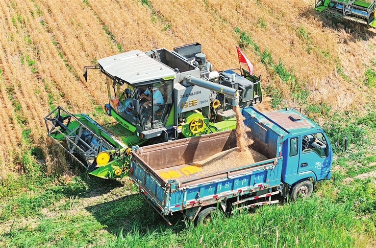 6月16日,在山东莱西市马连庄镇,收割机在卸载收获的小麦(无人机照片)。