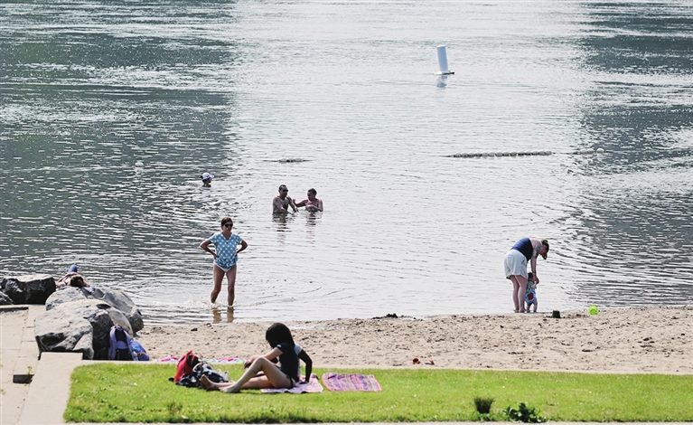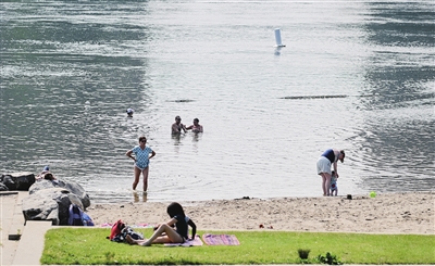 6月19日,在加拿大蒙特利尔,人们在圣劳伦斯河水中游玩避暑。加拿大政府已对蒙特利尔地区发布官方高温预警。新华社/欧新