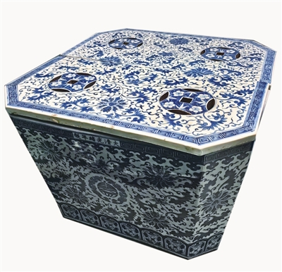 清代的冰箱,由古时的“冰鉴”(古代盛冰的容器)发展而来,除瓷制外,还有掐丝珐琅、木制等不同材质。瓷冰箱由于体量硕大、胎体厚重,且需要接胎而成,烧制难度很大。酷夏时从冰窖取出冰块置于其中,用于保存、冰镇瓜果饮品,通过盖面的钱形孔,又可散发冷气,起到调节室内温度的作用,既节能又环保,可谓一物两用。
