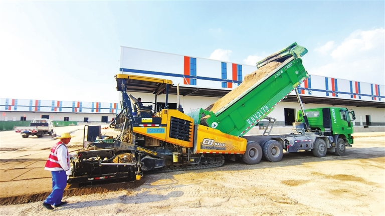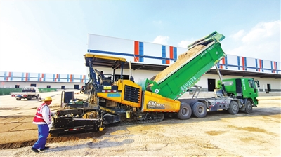 6月24日,杏花岭区杨家峪数字经济产业园智诚万家物流园区项目部,工人在铺设道路水稳层。该项目占地面积150余亩,总投资3.24亿元,功能集物流、仓储、办公为一体,建成后将实现电商、物流配送等环节有机结合,助力经济发展。牛利敏 郝晨光 摄影报道