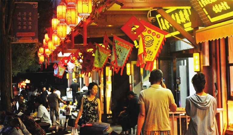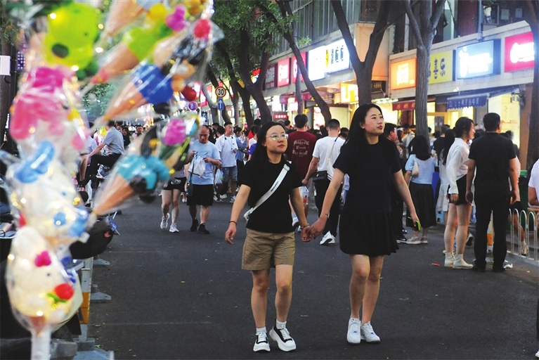 “火冒三丈”的烈火牛肉在铁板上滋滋作响;多彩的“绵绵冰”送来一份清爽;颜值与美味并存的车轮饼是小朋友最爱……傍晚时分,许坦东街“锦东小吃街”上,食客开始推杯换盏,到处飘散着食物香气。“无肉不欢”“遇见你很高兴”……一条条悬挂的彩灯,为100米长的小吃街装点出别致的氛围感。除了沾串、凉皮等本地特色小吃外,还有福鼎肉片、淄博烧烤等近百种外地美食,令人垂涎欲滴。小街最深处,播放着露天电影,三五好友围坐一桌,边吃边聊,尽享放松时刻。