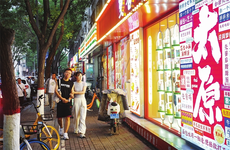 桃园二巷小吃街,承载着几代太原人的美食记忆,也是老太原们最津津乐道的。第一站爆浆臭豆腐、第二站三品马记面筋、第三站煎饼果子、第四站孙姐羊肉串、第五站火辣辣麻辣粉……这是一位博主总结的桃园二巷美食“攻略”。网民“@钱妹吃不饱”称,隔三岔五就得去一次,好吃的太多了。熙攘多年,这里留存更多的是街坊邻里的市井气息。在街上挽手散步的白发夫妻,嬉笑打闹的年轻情侣,勾勒出幸福的模样。