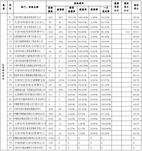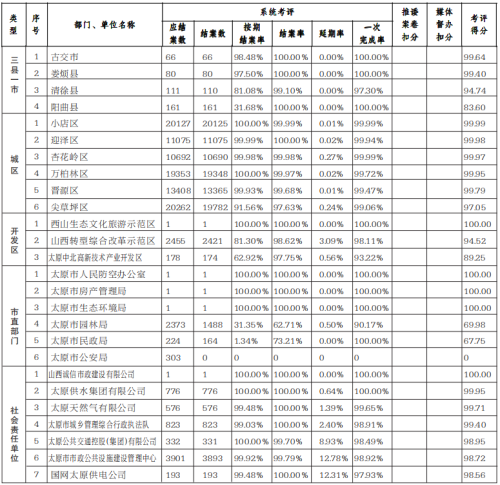 2.太原市体育局(全民健身指导中心)、太原市商务局、太原市应急管理局、太原市水务局、太原市文物局、太原市规划和自然资源局、太原市交通运输局、太原市学生发展服务中心(太原市语言文字测试中心)、太原市尖草坪热能有限公司、太原市市政公用工程质量安全站、太原市建设工程质量安全站、太原市消防救援支队、太原市绿色建筑与海绵城市发展中心、太原市黄河供水有限公司、太原日报社、山西兴业热力公司、山西日报社未接到中心派遣案卷,故不参与本月考核。