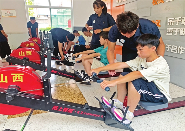 6月29日,山西省水上运动中心赛艇队队员走进建设路小学开展赛艇培训活动。专业测功仪练习提高了青少年对赛艇运动的认识和兴趣,同时培养了他们的团队合作精神。米国伟 摄
