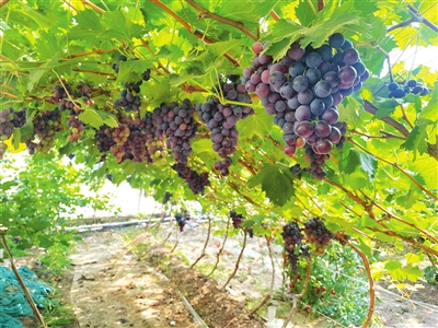 这个示范园占地面积1300余亩,建有366个温室大棚,其中一半以上种葡萄,有蜜光、蓝宝石、玉龙玫瑰等品种。“我们种葡萄5年了,大棚内光照充足、利通风,葡萄长得好,单棚年产量都在5000公斤以上。”村民常大妈介绍,这里葡萄的采摘期较长,每年5月至10月都能采摘。