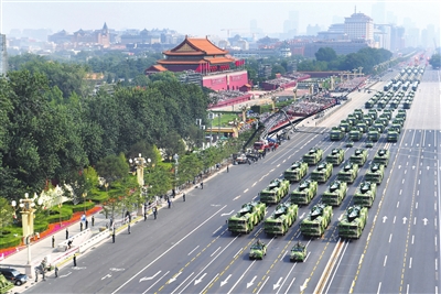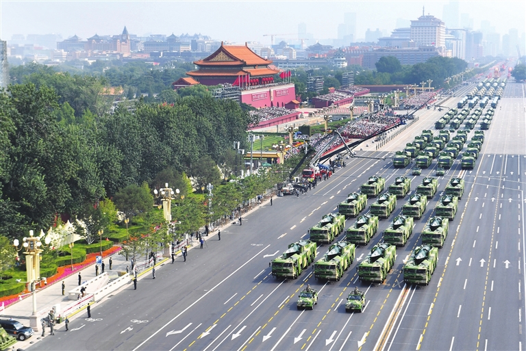 580台(套)地面装备组成32个装备方队,陆、海、空军航空兵160余架战机组成12个空中梯队……受阅装备全部为中国制造,40%为首次亮相,展示出人民军队基本实现机械化、加快迈向信息化的如虹气势。