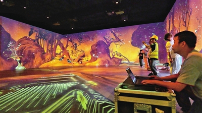 7月7日上午,技术人员在沉浸式互动体验区进行最后调试。