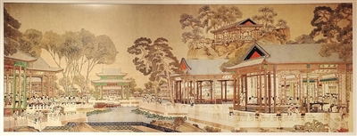 《大观园图》作为《红楼梦》文学巨著的视觉再现,细腻地勾勒出了贾府的奢华与园林的精致。画作主要以平视的角度和近于广角镜头的构图方式,展现了发生在大观园六处景致中的故事,时间跨越春、夏、秋三季,时空交错,异彩纷呈。画面中塑造了百余个人物,既有雍容华贵的贵妇,也有机敏伶俐的丫鬟,展现了复杂而微妙的社会关系网,令观者仿佛步入那座梦幻般的府邸,亲历一场场悲欢离合。