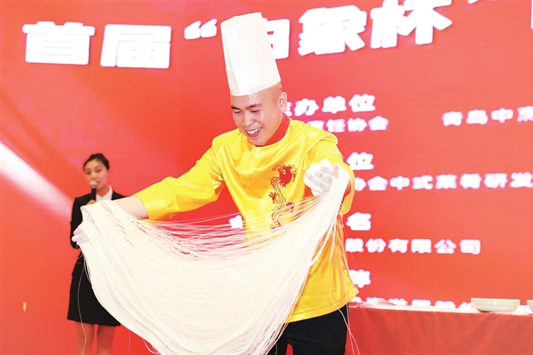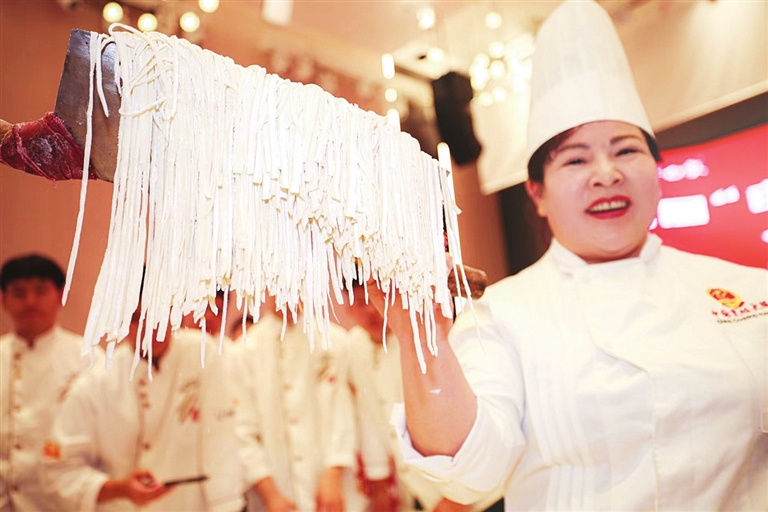 技艺精湛的面食师傅站在舞台中央,一块普通的面团在他们手中仿佛有了生命,被不断拉伸、揉搓、变换着形状,动作行云流水。张素香,国家名厨,是中央广播电视总台《满汉全席》面食擂台赛总冠军。大刀锵锵,其刀拨面仿佛如银练飞瀑而下;面团旋转,其转盘拨鱼儿,就像快乐的小鱼跳跃而出,那场景堪称一绝,让人难忘。