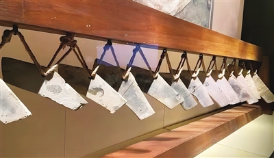 与镈相配的是石磬。磬一套13枚,多为灰白色石灰岩制成,形制相近,大小相次。除个别磬大致完整外,余皆破碎,并伴有严重的溶蚀现象。但据说敲击还能发出清脆的乐声。