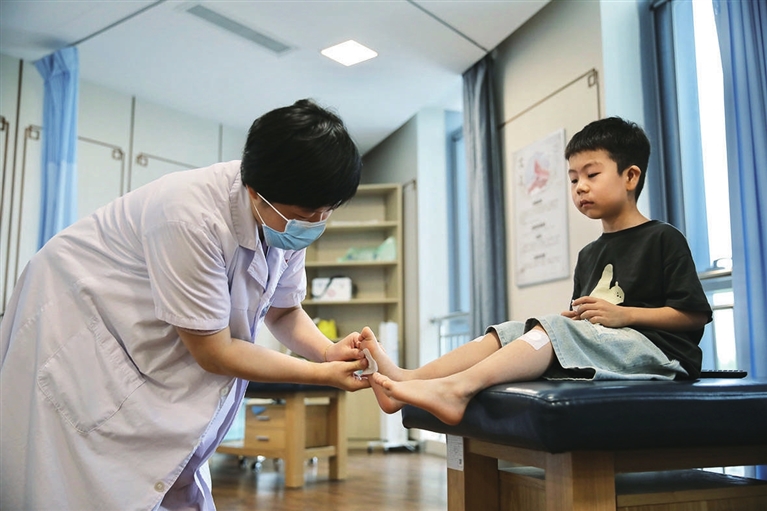 7月15日入伏,“三伏贴”成为不少市民冬病夏治,调理身体的选择。图为太原市妇幼保健院医生给小朋友贴“三伏贴”。