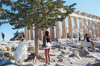 7月16日,一名游客在希腊雅典卫城游览时喝水降温。近日,希腊多地遭遇高温天气。新华社/美联
