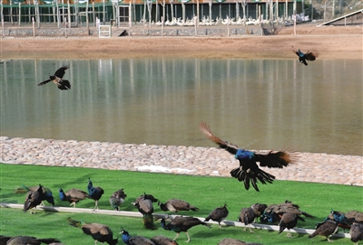 随着饲养员一声哨响,数百羽孔雀从山顶展翅腾飞、盘旋飞翔、百鸟齐舞,引得游客阵阵惊叹,场面非常震撼。在这里,游人还可以与这些孔雀一起嬉戏、拍照,非常有趣。
