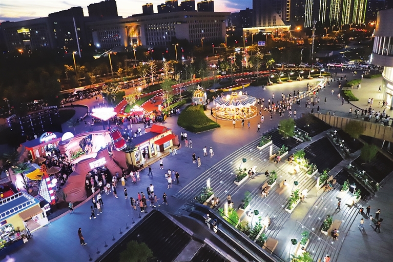 7月21日晚,万象城广场上各种休闲项目吸引民众前来纳凉游玩。暑期我市各种主题活动、演出不断,带火了夜经济。张昊宇 摄