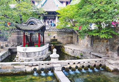 唐代大诗人李白《忆旧游寄谯郡元参军》一诗描写晋祠之水:“时时出向城西曲,晋祠流水如碧玉。浮舟弄水箫鼓鸣,微波龙鳞莎草绿。”晋祠水为何如此好呢?北宋文学家范仲淹《题晋祠水》道出原委:“神哉叔虞庙,地胜出佳泉。”北宋欧阳修《过并州晋祠泉》,用“古城南出十里间,鸣渠夹路何潺潺”“晋水今入并州里,稻花漠漠浇平田”,来称赞晋水之美、稻米之佳。欧阳修还为晋祠周柏留下“地灵草木得余润,郁郁古柏含苍烟”的诗句。圣母殿是晋祠主殿,宋人汪藻《题晋祠》赞曰“圣母慈灵昭往古,高题崇号重来今”。咏叹晋水,金代元好问有诗“惠远祠前晋溪水,翠叶银花清见底”。明末清初学者傅山在晋祠居住多年,留下“难老”立匾等墨迹。清代学者朱彝尊五游晋祠,作《游晋祠记》,雕镌成碑。清代进士杨二酉是晋祠人,祠中不少匾额石刻出自其手……