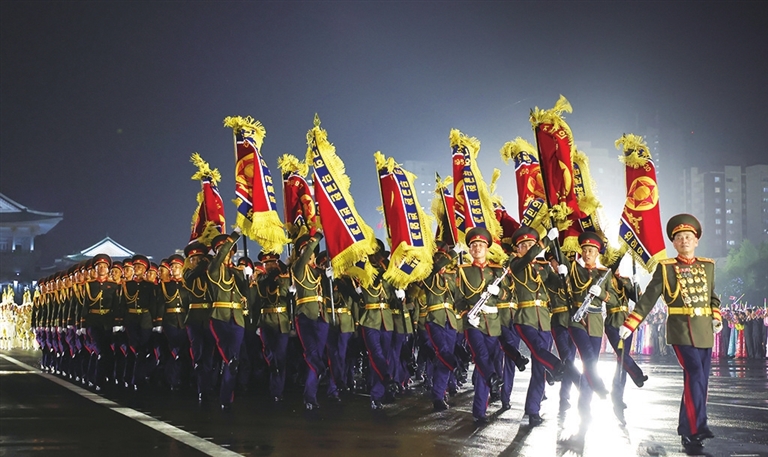 这张朝中社发布的照片显示,7月27日,祖国解放战争时期象征方队纪念行进仪式在朝鲜首都平壤举行。综合朝中社28日报道,朝鲜27日在首都平壤隆重举行多场活动,纪念祖国解放战争胜利71周年。朝鲜劳动党总书记、国务委员长金正恩出席上述活动。新华社/朝中社