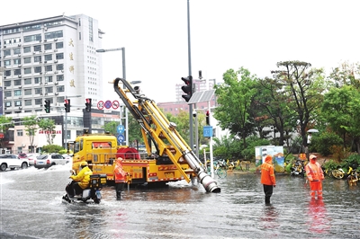 7月30日,太原市市政公共设施建设管理中心派出大型抽排车在南中环街长治路口进行排水作业,清除路面积水。