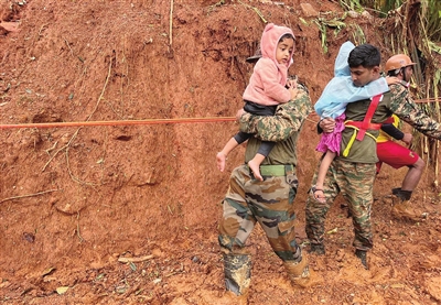 7月31日,救援人员在印度南部喀拉拉邦的山体滑坡现场转移受灾民众。据印度南部喀拉拉邦政府部门7月31日发布的公告,截至目前,喀拉拉邦山体滑坡遇难人数已上升至148人,另有128人受伤。新华社/印度联合新闻社