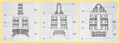 编钟按其形状划分通常可分为三种:甬钟、钮钟与镈钟(见图1)。甬钟是上窄下宽,舞部平坦,铣部呈月牙形,舞部上有甬柱悬挂的环,位于舞部与甬柱衔接的部位;钮钟与甬钟大体相似,舞部上的甬柱换成了环状挂绳的钮;镈钟上下相差不多,成浑圆状,铣部齐平,钮部造型华丽,功能与钮钟相同。三种钟从下方观测都是“合瓦”形,即像两片瓦合起来的样子(见图2)。
