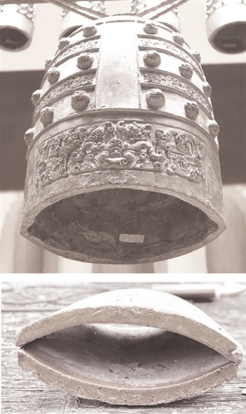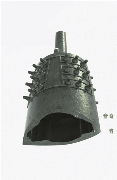 我们仔细从下方观察编钟的隧部,可以看出钟壁厚度不一样,厚薄的变化是有规则的(见图4)。因此,编钟的校音过程是在隧部进行的,此过程主要是通过打磨、刮削钟隧,以调整其厚薄,进而达到校正音准的目的。