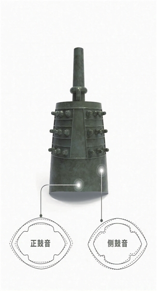 编钟之所以呈现“合瓦”形,源于其独特的“一钟双音”设计构思。这一设计早在3000多年前的古代便已存在,而时至今日,其背后的奥秘仍未被完全揭示。“一钟双音”是指一个钟可以敲出来两个音——正鼓音和侧鼓音(见图3)。通常正鼓音与侧鼓音之间相差小三度,用现在物理学解释,就是一个钟可以通过敲击不同部位,从而出现两种振荡模式,发出两个音。