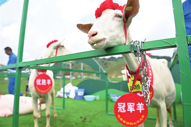 8月2日拍摄的陇县首届奶山羊大赛的冠军羊。当日,陇县首届奶山羊大赛在陕西宝鸡陇县关山草原举行,“美羊羊”综合评选、“养羊能手”技能大赛等活动吸引众多奶山羊养殖户参与其中,在比赛中交流养殖经验。近年来,陇县大力发展奶山羊产业,目前,陇县奶山羊存栏57.2万只,全产业链总产值约85亿元。新华社记者 邹竞一 摄