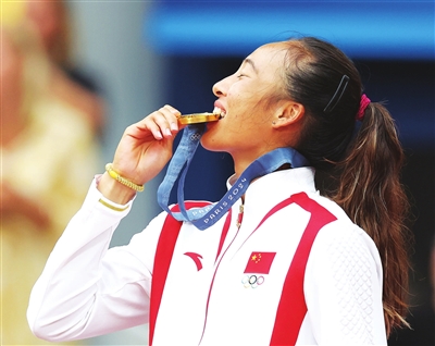 8月3日,郑钦文在颁奖仪式上。当日,在巴黎奥运会网球女子单打金牌赛中,中国选手郑钦文2比0战胜克罗地亚选手维基奇,夺得金牌。新华社记者 高 静 摄