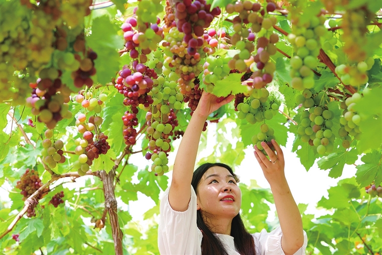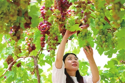 8月6日,村民在重庆市黔江区蓬东乡麻田村一个葡萄基地采摘。夏日时节,各地农民抓紧农时,田间地头一片繁忙。新华社发 (杨 敏 摄)