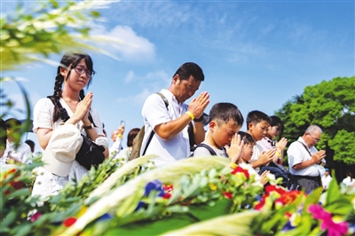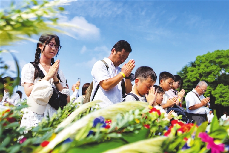 8月6日,在日本广岛举行的遭原子弹轰炸79周年纪念仪式后,人们排队献花,纪念原子弹轰炸受害者。日本广岛市6日在和平纪念公园举行遭原子弹轰炸79周年纪念仪式。日本各地民众在公园举行集会,抗议日本政府加速军备扩充的做法,呼吁日本政府以实际行动维护地区和平。新华社记者 张笑宇 摄