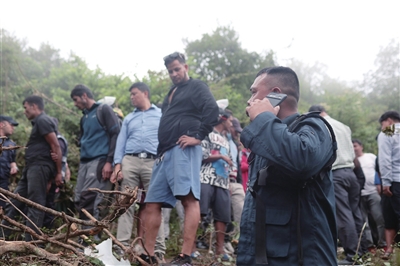 8月7日,在尼泊尔加德满都附近的努瓦果德地区,人们聚集在直升机坠毁现场。新华社发(苏拉韦·什雷斯塔 摄)