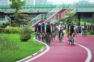 晚霞映照的自行车道上,骑行身影飞驰而过;夜风轻拂的空地上,飞盘爱好者三五成群,在奔跑传接中挥洒激情;高低起伏的场地,一群小轮车手飞驰腾空,挑战着极限……在移步异景的风景变幻间,感受草木蔚然的同时,身体也得到释放。