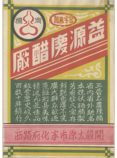 益源庆公记商标中除益源庆醋厂的名称、葫芦形商标和所在地址等信息外,对其陈醋特点也进行了简单地介绍:“三晋名产陈醋,省内省外驰名,本号伏晒精制,芳香经久常存,鲜艳色泽不变,广大群众欢迎,烹饪别具美味,馈送尤是佳品,经营历史悠久,百数十年销行。”