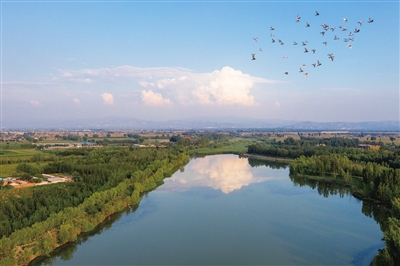 群鸟飞过昌源河国家湿地公园上空(8月14日摄,无人机照片)。昌源河国家湿地公园位于山西省祁县,河道绵延36公里,总面积948公顷,以河流湿地、沼泽湿地和库塘湿地及其生物多样性为基本资源特征。近年来,当地通过湿地保护与恢复、科普宣教、完善基础设施等工程,有效维护了昌源河湿地生态系统的完整性。如今的昌源河国家湿地公园,不仅成为群众休闲娱乐的好去处,也成为众多珍稀鸟类的栖息乐园。新华社记者 杨晨光 摄