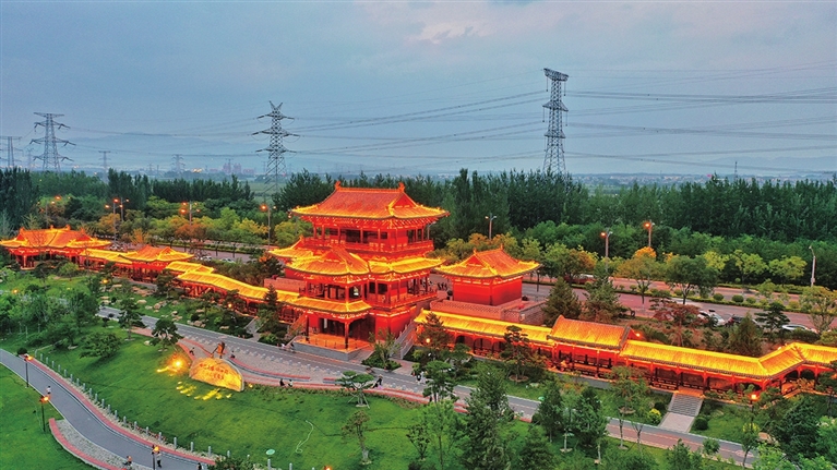 8月17日,华灯初上,汾河景区雁丘园在灯光装点下更显古朴典雅,充满诗情画意。李学军 王 昕 摄影报道