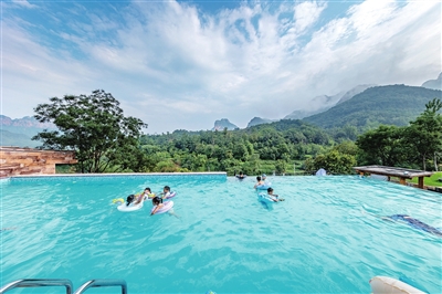 8月16日,游客在武安市漫宁民宿游泳池内游泳。近年来,河北省武安市以太行山区众多优质旅游资源为依托,积极发展民宿产业,不断推动民宿向高端化、特色化、精品化迈进,形成促进乡村振兴的新引擎。新华社记者 牟 宇 摄