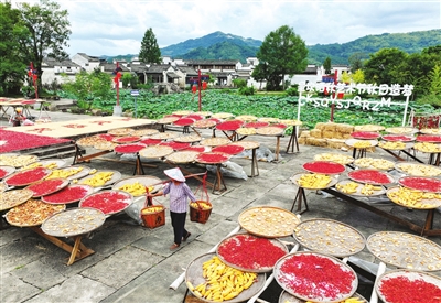 进入秋季,安徽省黄山市徽州区呈坎村村民趁着晴好天气,晾晒玉米、南瓜、红辣椒等农作物,吸引不少游客前往观赏,感受丰收的喜悦。 新华社发(施亚磊 摄)